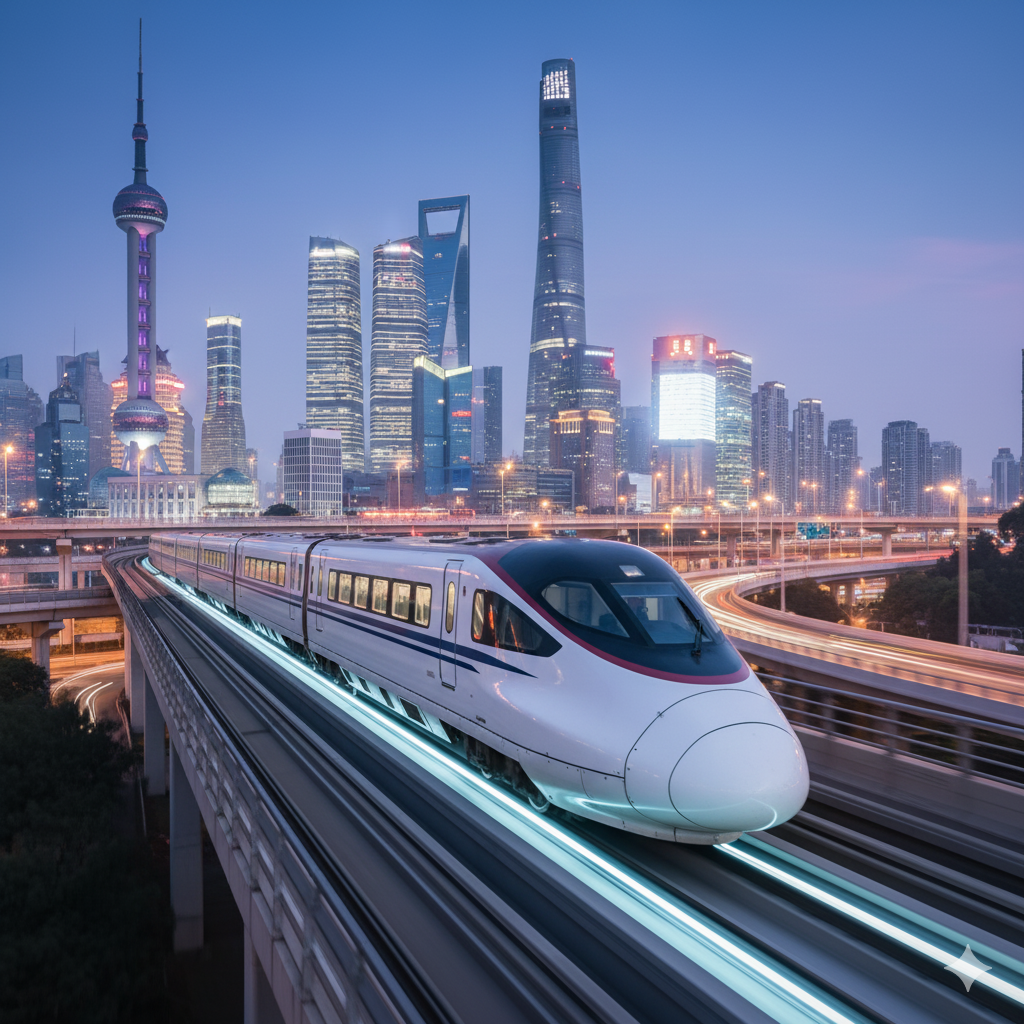 Um dos exemplos mais impressionantes é o Maglev de Xangai, o primeiro trem comercial de levitação magnética de alta velocidade do mundo. Inaugurado em 2004, ele atinge uma velocidade máxima de 431 km/h em um trajeto de 30 km, ligando o Aeroporto Internacional de Pudong à estação de metrô Longyang Road. Essa tecnologia, que suspende o trem sobre trilhos usando eletromagnetismo, elimina o atrito e permite velocidades ainda maiores, sendo um marco para o futuro da ferrovia.
