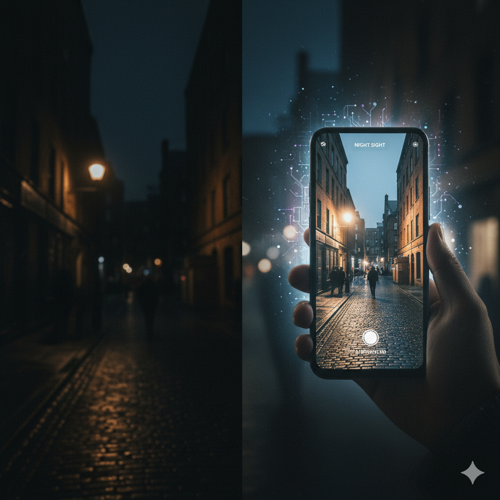 - Modo Noturno Evoluído: Não se limita mais a clarear fotos escuras. A IA agora é capaz de distinguir elementos, corrigir cores e reduzir ruídos de forma seletiva, garantindo que as luzes artificiais não fiquem estouradas e as sombras mantenham os detalhes.